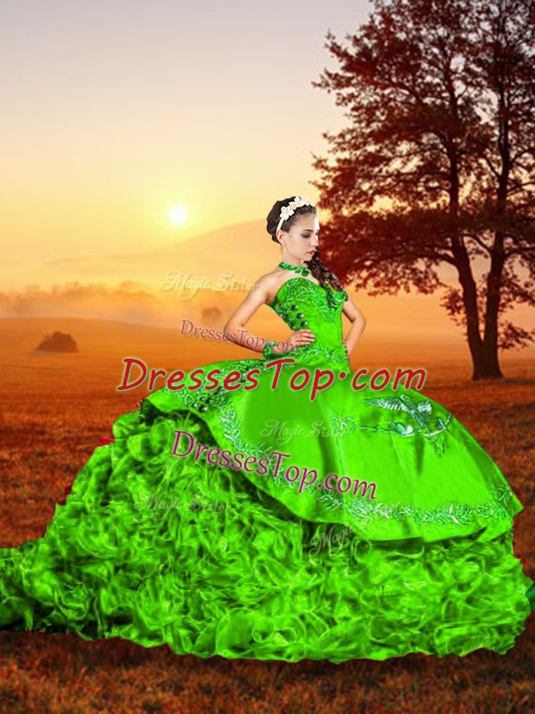Spectacular Green Sleeveless Organza Brush Train Lace Up Vestidos de Quinceanera for Military Ball and Sweet 16 and Quinceanera
