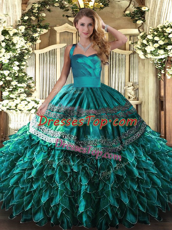 Spectacular Halter Top Sleeveless Quinceanera Gowns Floor Length Embroidery and Ruffles Turquoise Organza