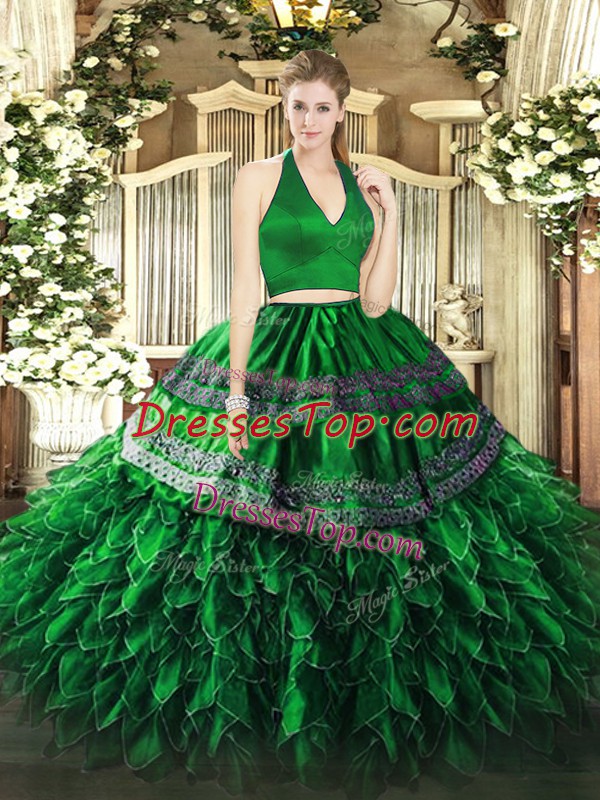Spectacular Organza Halter Top Sleeveless Zipper Appliques and Ruffles Quinceanera Dresses in Dark Green