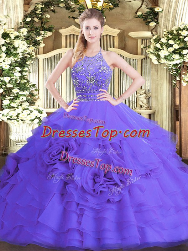 Spectacular Purple Ball Gowns Tulle Halter Top Sleeveless Beading and Ruffled Layers Floor Length Zipper Sweet 16 Dress