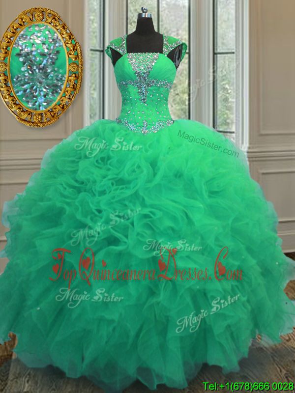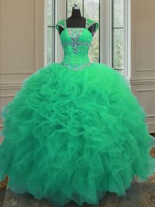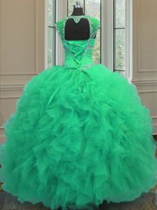 Spectacular Purple Lace Up Straps Beading and Ruffles and Sequins Quinceanera Dresses Organza Cap Sleeves