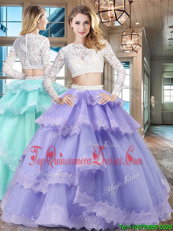 Spectacular Scoop Beading and Lace and Ruffled Layers Sweet 16 Dress Lavender Zipper Long Sleeves Floor Length