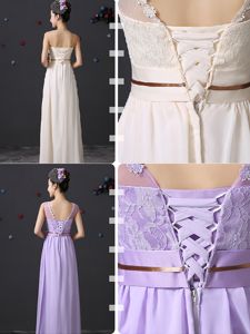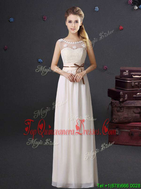Spectacular See Through White Chiffon Lace Up Scoop Sleeveless Floor Length Vestidos de Damas Lace and Appliques and Belt