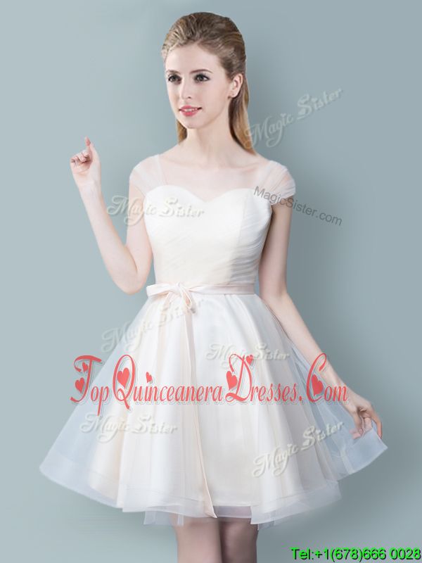 Spectacular Straps Straps Champagne Cap Sleeves Tulle Zipper Damas Dress for Prom and Party and Wedding Party