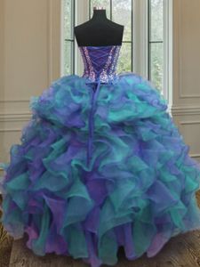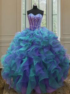 Spectacular Sweetheart Sleeveless Quinceanera Gowns Floor Length Beading and Ruffles Multi-color Organza