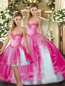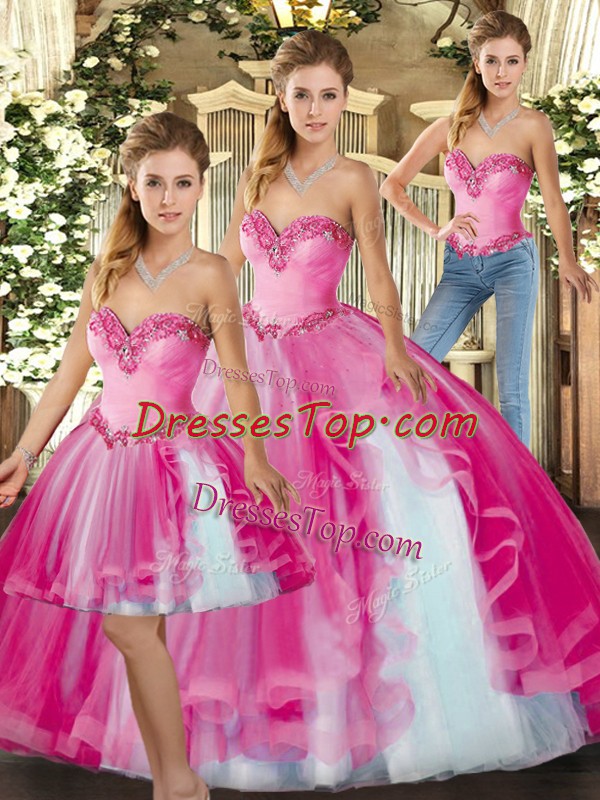 Spectacular Three Pieces Vestidos de Quinceanera Fuchsia Sweetheart Organza Sleeveless Floor Length Lace Up