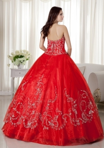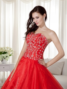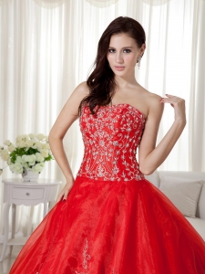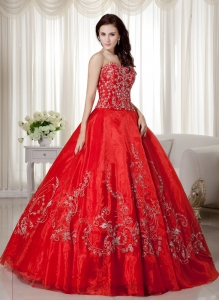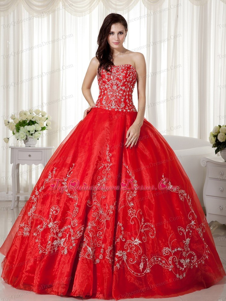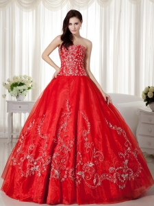 Strapless Floral Embroidery Red Quinceanera Dress Zipper Up