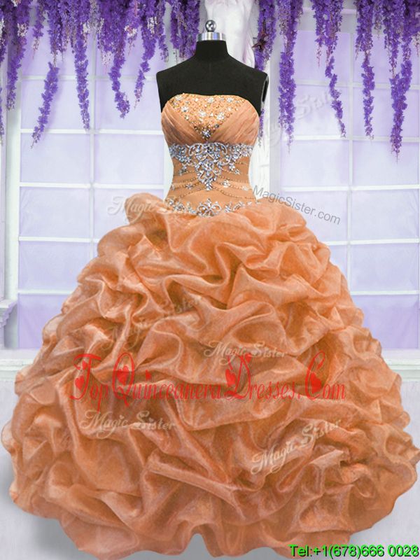 Strapless Sleeveless 15 Quinceanera Dress Floor Length Beading Orange Organza