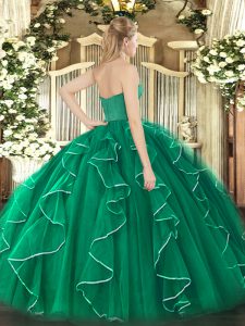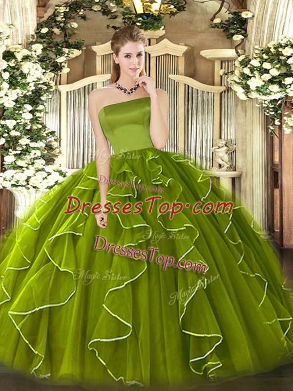 Strapless Sleeveless Quince Ball Gowns Floor Length Ruffles Olive Green Tulle