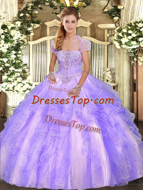 Strapless Sleeveless Quinceanera Dresses Floor Length Appliques and Ruffles Lavender Tulle