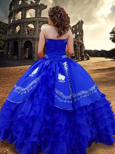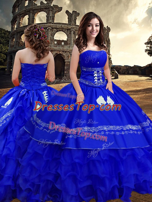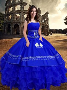 Strapless Sleeveless Quinceanera Gown Floor Length Embroidery and Ruffled Layers Royal Blue Taffeta