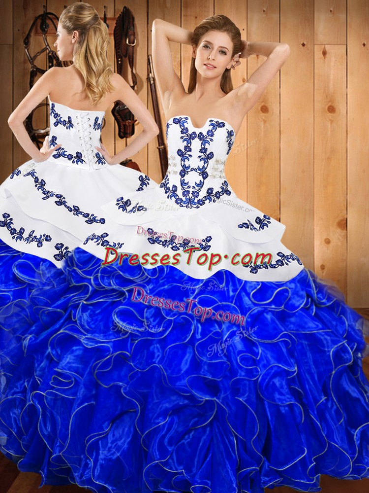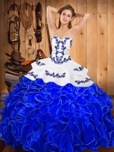 Strapless Sleeveless Satin and Organza Quinceanera Dresses Embroidery and Ruffles Lace Up