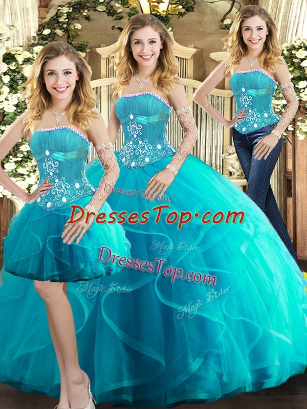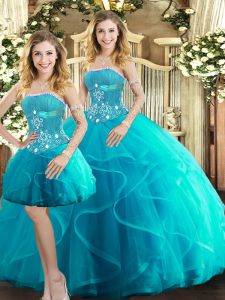 Strapless Sleeveless Sweet 16 Quinceanera Dress Floor Length Beading and Ruffles Aqua Blue Tulle