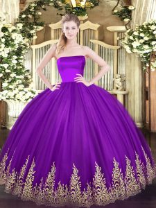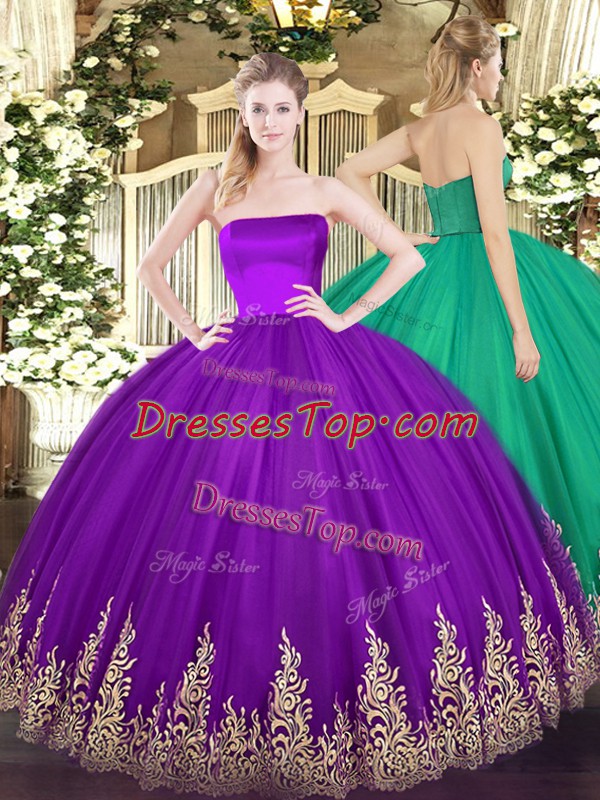 Strapless Sleeveless Tulle Quince Ball Gowns Appliques Zipper
