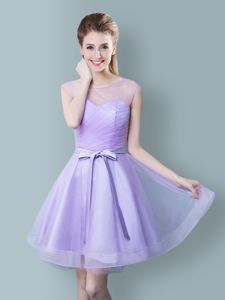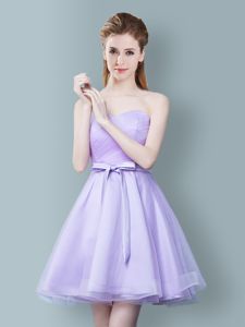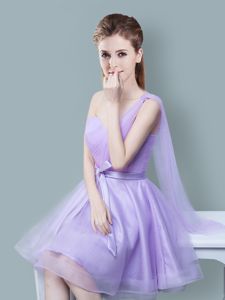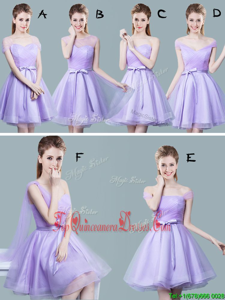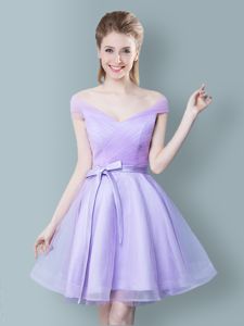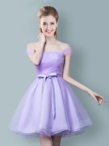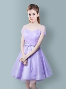 Straps Cap Sleeves Quinceanera Court of Honor Dress Knee Length Ruching and Bowknot Lavender Tulle