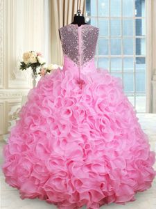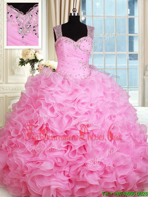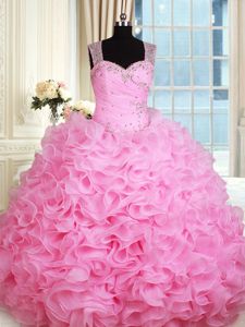 Straps Sleeveless 15 Quinceanera Dress Floor Length Beading and Ruffles Rose Pink Organza