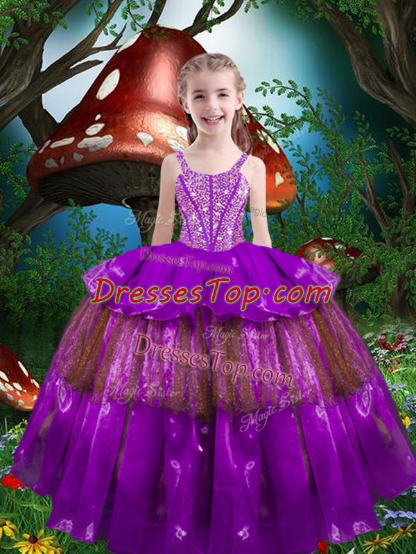 Straps Sleeveless Lace Up Child Pageant Dress Eggplant Purple Organza