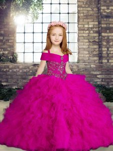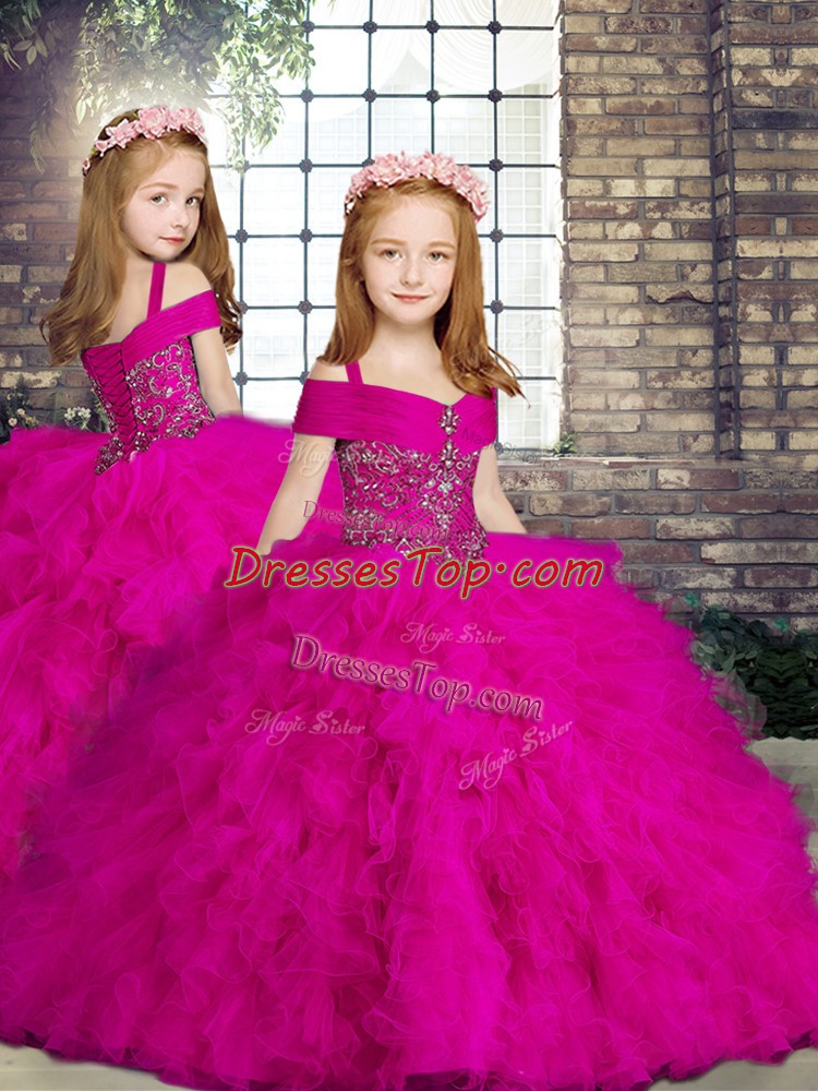 Straps Sleeveless Lace Up Little Girls Pageant Gowns Fuchsia Tulle