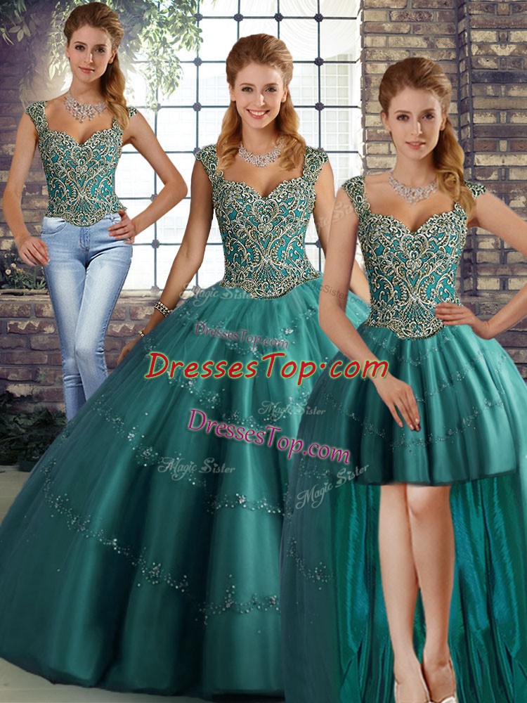 Straps Sleeveless Lace Up Sweet 16 Quinceanera Dress Teal Tulle