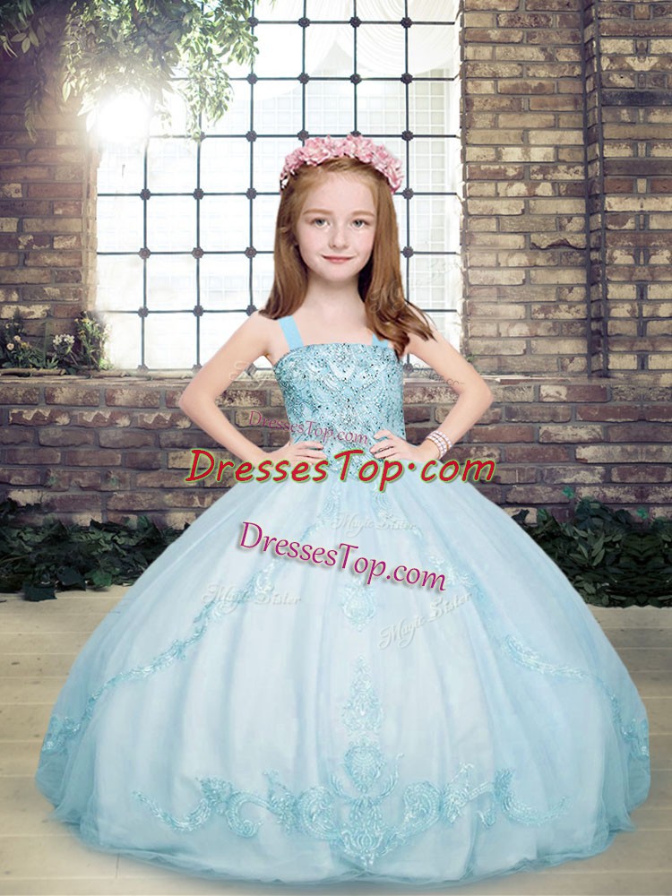 Straps Sleeveless Little Girl Pageant Gowns Floor Length Beading Light Blue Tulle