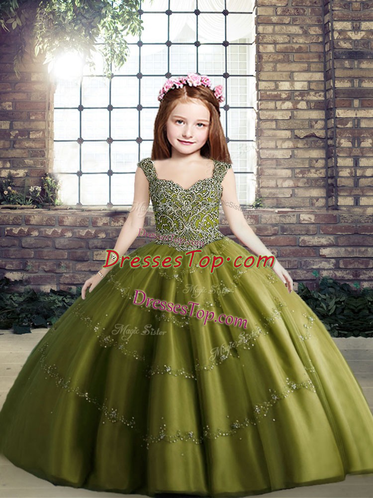 Straps Sleeveless Little Girls Pageant Dress Wholesale Floor Length Beading Olive Green Tulle