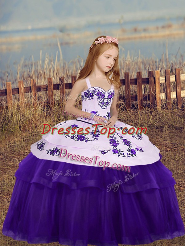 Straps Sleeveless Little Girls Pageant Dress Wholesale Floor Length Embroidery Eggplant Purple Tulle