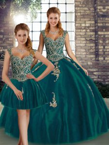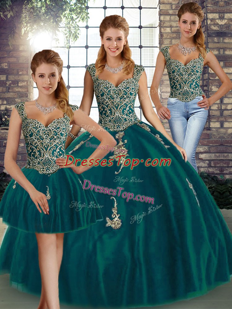 Straps Sleeveless Sweet 16 Dresses Floor Length Beading and Appliques Peacock Green Tulle