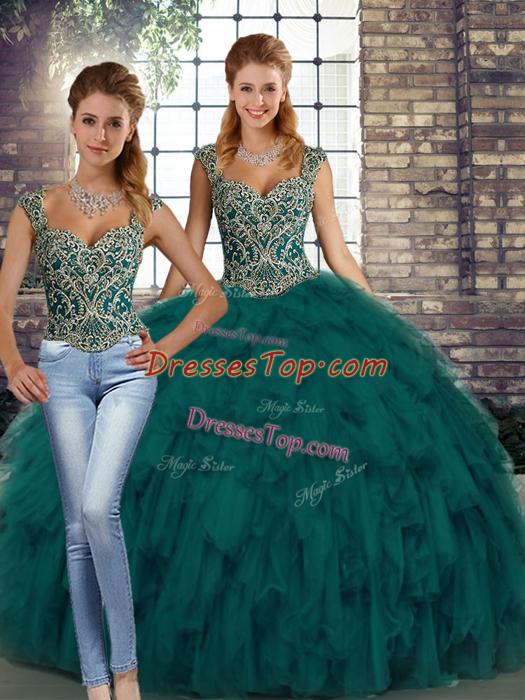 Straps Sleeveless Sweet 16 Dresses Floor Length Beading and Ruffles Peacock Green Organza