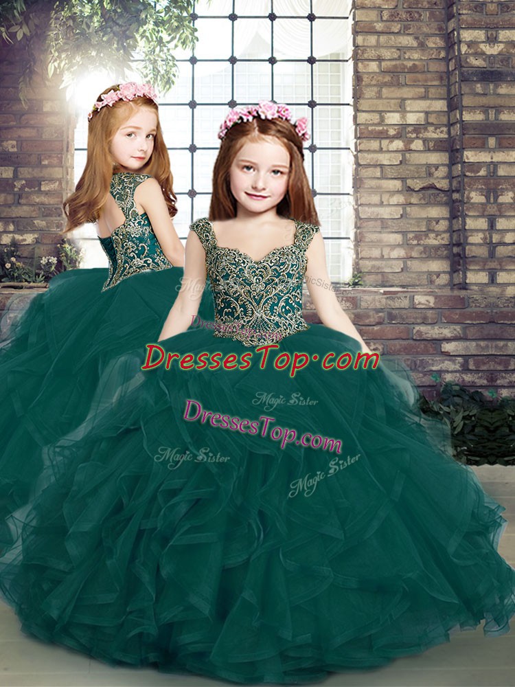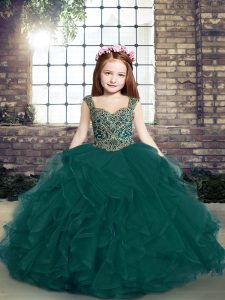 Straps Sleeveless Tulle Girls Pageant Dresses Beading and Ruffles Lace Up