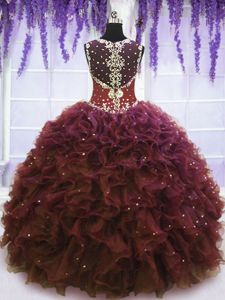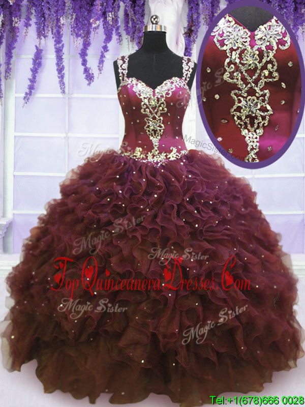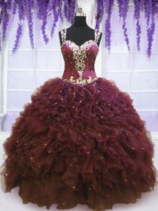 Straps Straps Floor Length Burgundy Quinceanera Gown Tulle Sleeveless Beading and Ruffles