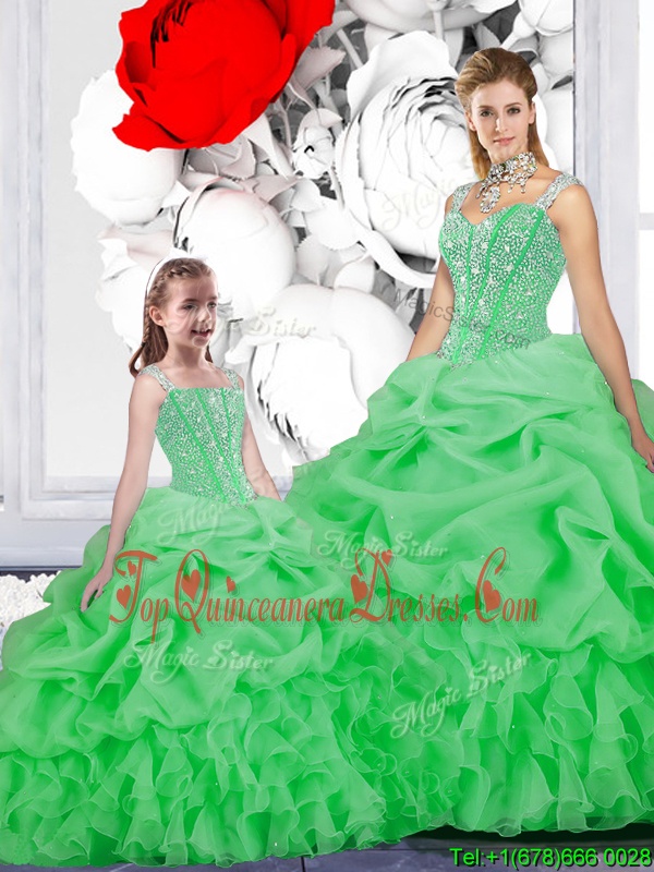 Straps Straps Green Organza Lace Up Sweet 16 Quinceanera Dress Sleeveless Floor Length Beading and Ruffles and Pick Ups