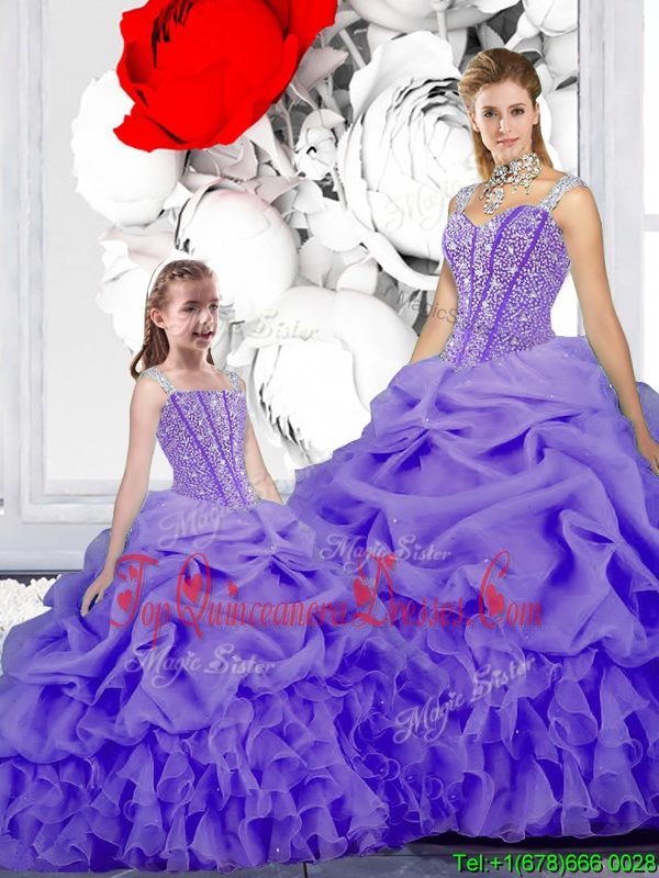 Straps Straps Sleeveless Floor Length Beading and Ruffles and Pick Ups Lace Up Quinceanera Gown with Lavender