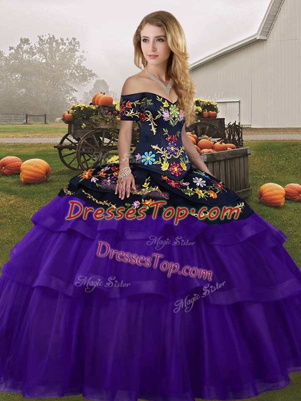 Stunning Black And Purple Tulle Lace Up Vestidos de Quinceanera Sleeveless Brush Train Embroidery and Ruffled Layers