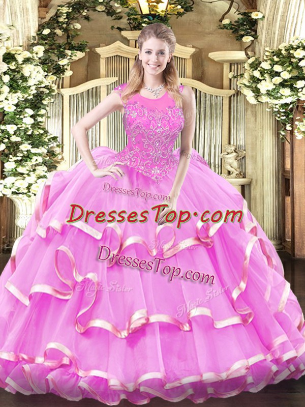 Stunning Lilac Sleeveless Floor Length Beading and Ruffled Layers Zipper Quinceanera Dresses