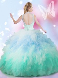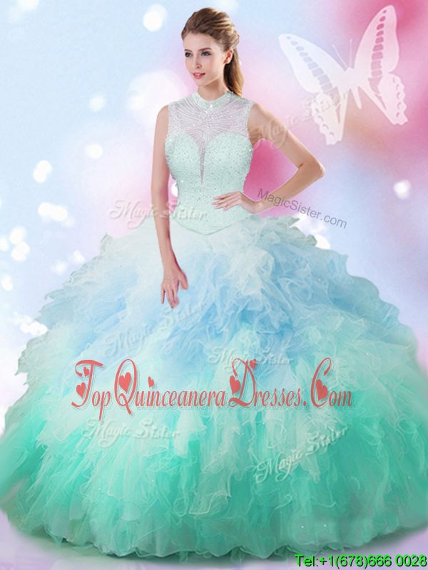 Stunning Multi-color Quince Ball Gowns Military Ball and Sweet 16 and Quinceanera and For with Beading and Ruffles High-neck Sleeveless Lace Up