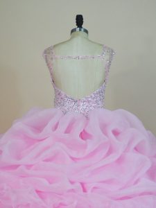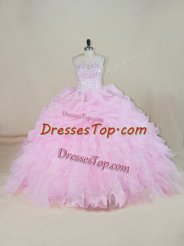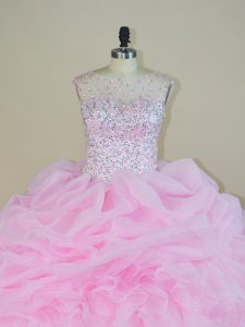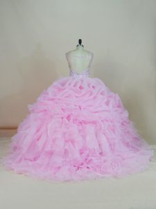 Stunning Pink Backless Scoop Beading and Ruffles Sweet 16 Dress Organza Sleeveless Brush Train