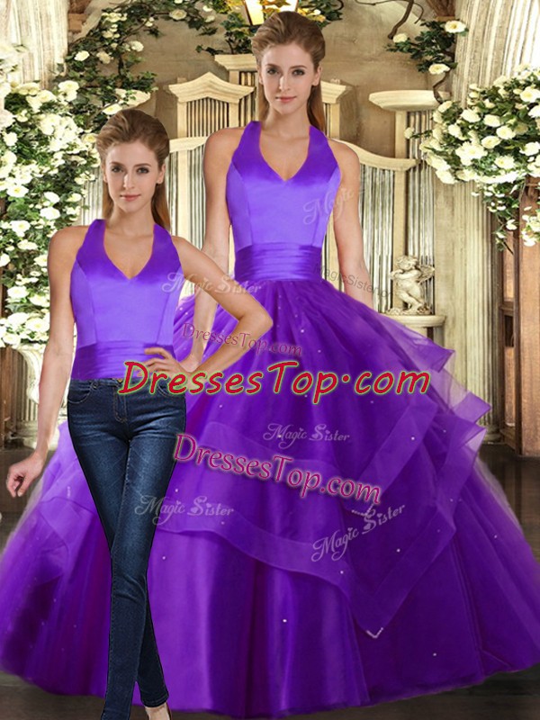 Stunning Purple Tulle Lace Up Strapless Sleeveless Floor Length Sweet 16 Quinceanera Dress Ruffled Layers