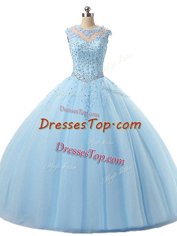 Stunning Scoop Sleeveless Lace Up Quinceanera Gowns Light Blue Tulle