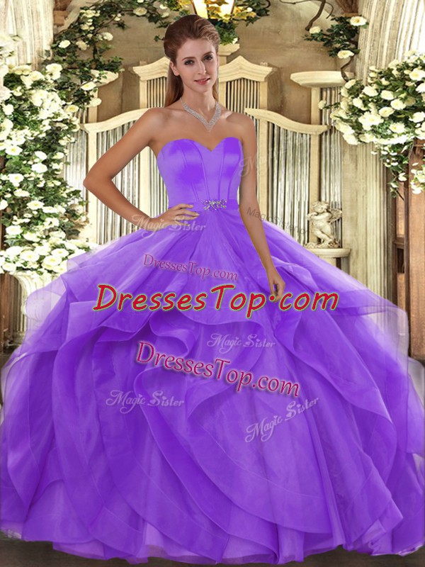 Stunning Sleeveless Tulle Floor Length Lace Up Sweet 16 Dress in Lavender with Beading and Ruffles