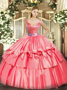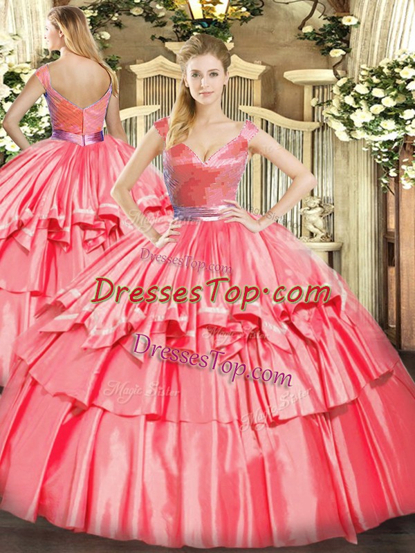 Stunning V-neck Sleeveless Tulle Quinceanera Gown Beading and Ruffled Layers Zipper