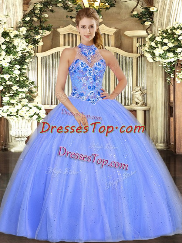 Stylish Ball Gowns Ball Gown Prom Dress Blue Halter Top Tulle Sleeveless Floor Length Lace Up