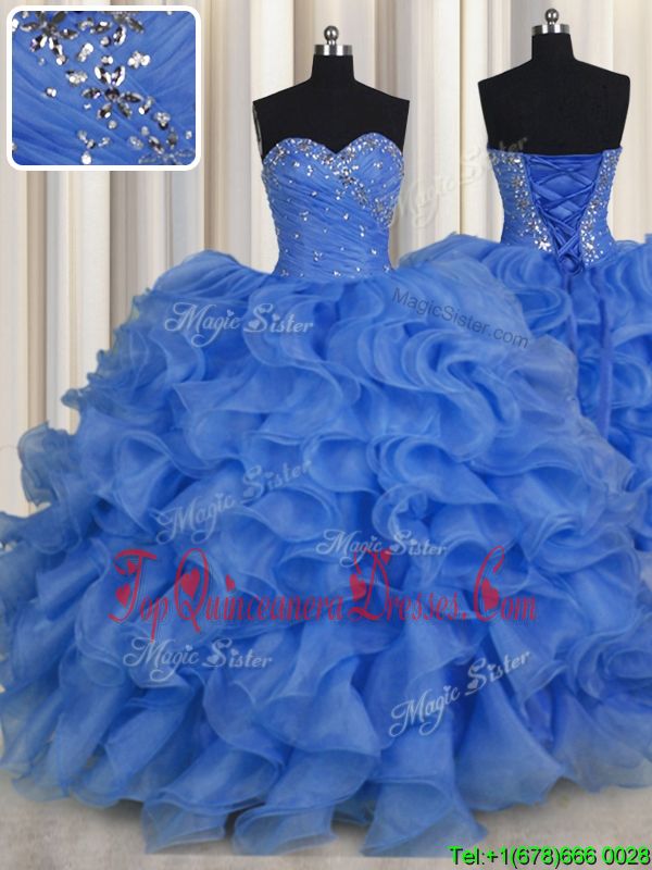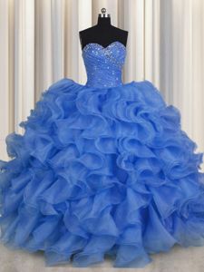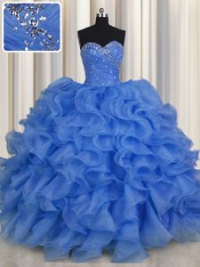 Stylish Blue Lace Up Sweet 16 Dress Beading and Ruffles Sleeveless Floor Length