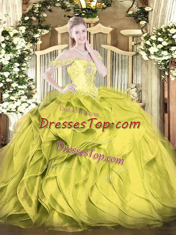 Stylish Floor Length Olive Green 15th Birthday Dress Organza Sleeveless Beading and Ruffles