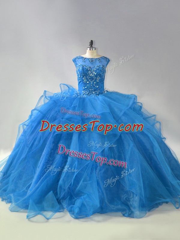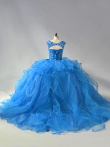 Stylish Lace Up Sweet 16 Quinceanera Dress Blue for Sweet 16 and Quinceanera with Beading and Ruffles Brush Train