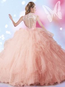 Stylish Sequins Peach Sleeveless Tulle Zipper Quince Ball Gowns for Military Ball and Sweet 16 and Quinceanera