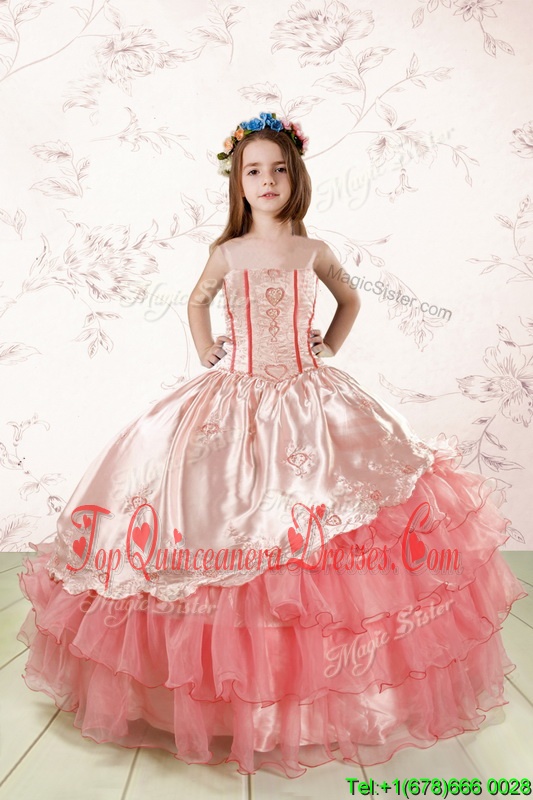 Stylish Sleeveless Organza Floor Length Lace Up Kids Pageant Dress in Baby Pink for with Embroidery and Ruffled Layers