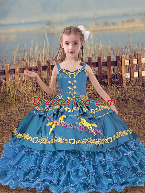 Stylish Straps Sleeveless Girls Pageant Dresses Floor Length Beading and Embroidery and Ruffled Layers Blue Organza