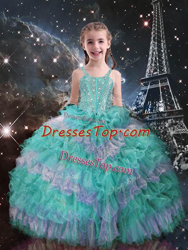 Stylish Straps Sleeveless Girls Pageant Dresses Floor Length Beading and Ruffled Layers Turquoise Organza