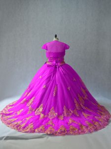 Stylish Sweetheart Sleeveless Court Train Lace Up Quince Ball Gowns Fuchsia Tulle