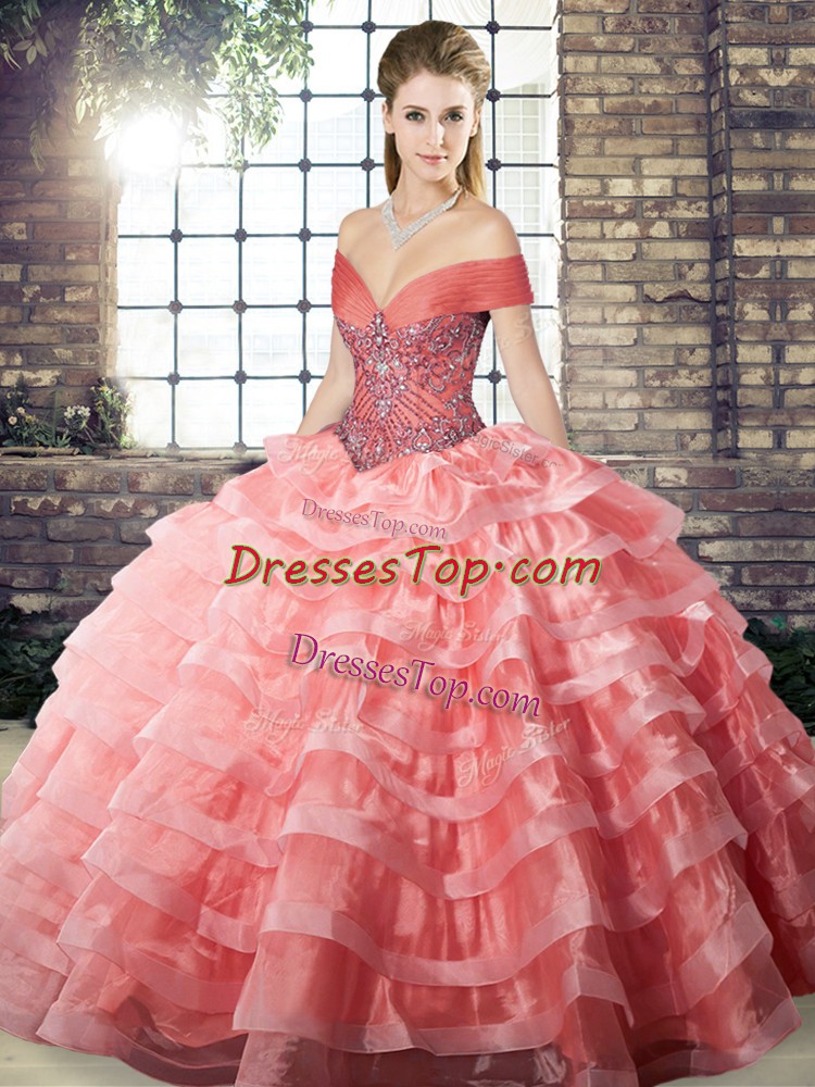 Stylish Watermelon Red Quinceanera Gown Organza Brush Train Sleeveless Beading and Ruffled Layers